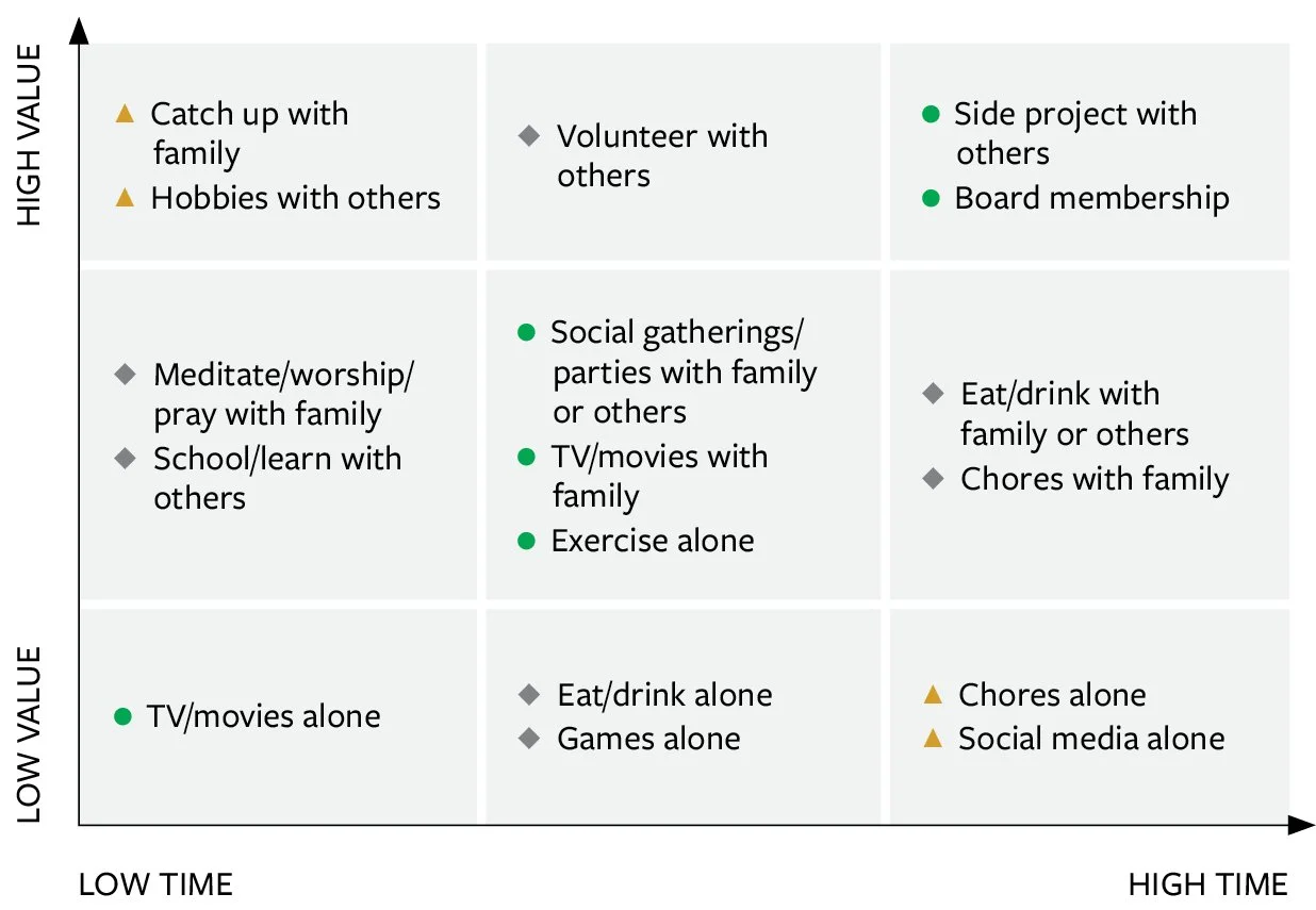 First, Taylor looked at activities on the lower right of the matrix, the low-value but more time-consuming activities. They realized that solitary activities, such as doing chores or errands alone and browsing social media, were taking up more time than they realized yet not contributing much to their happiness or mental health. They also noticed that some activities, such as chores, were more valuable to them when shared with family or others. Taylor decided that while errands and chores were necessary, they could perhaps time-box these activities to spend less time on them or try to do them with others whenever possible to increase their value. Taylor then shifted focus to the top left, which listed high-value activities that they spent little time on, such as catching up with family. They considered how part of the time they currently spent on social media and playing games alone could be reallocated to catching up with family or doing hobbies with others.