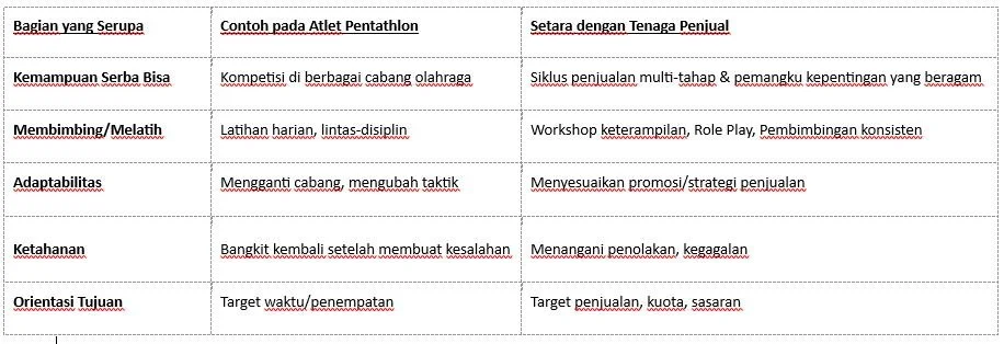 Saat waktu hening dan meditasi pagi saya minggu lalu, saya membaca sebuah blog dari mentor saya, Dwight Hill, tentang bagaimana hidup ini seperti mempersiapkan diri dan "bertanding" dalam pentathlon. Hal ini mendorong saya untuk berpikir tentang bagaimana tenaga penjual dan atlet pentathlon memiliki kesamaan dalam upaya mereka mencapai keunggulan untuk bersaing—atlet di arena olahraga dan tenaga penjual di dunia bisnis. Setelah meninjau kembali pengalaman saya dalam membina para tenaga penjualan dan melakukan riset menggunakan AI, berikut adalah pandangan saya mengenai kesamaan tersebut.